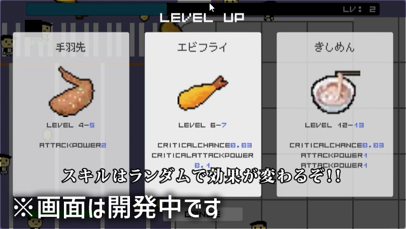 持ち込んだ料理(武器)をレベルアップ(調理)するたびにランダムで数値が変わっていきます。ステージクリアの際一つだけ強化した武器(調理済み)の料理をレシピとして持ち帰ることが出来ます。
